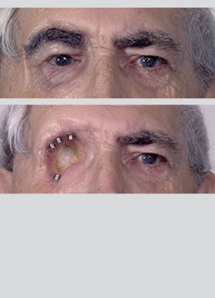 Sometimes the surgical removal of the entire eyelid and eye socket is necessary; an “orbitae excentration”. In these cases, the prosthesis needs to replace the eye itself, as well as its surroundings. The eye part of the orbital prosthesis is created of acrylic, while the surrounding skin is made of silicone. The orbital prosthesis has lashes as well as eyebrows, for as life-like a result as possible. Titanium implants are preferable for retention, but skin glue or spectacle frames are just as common.